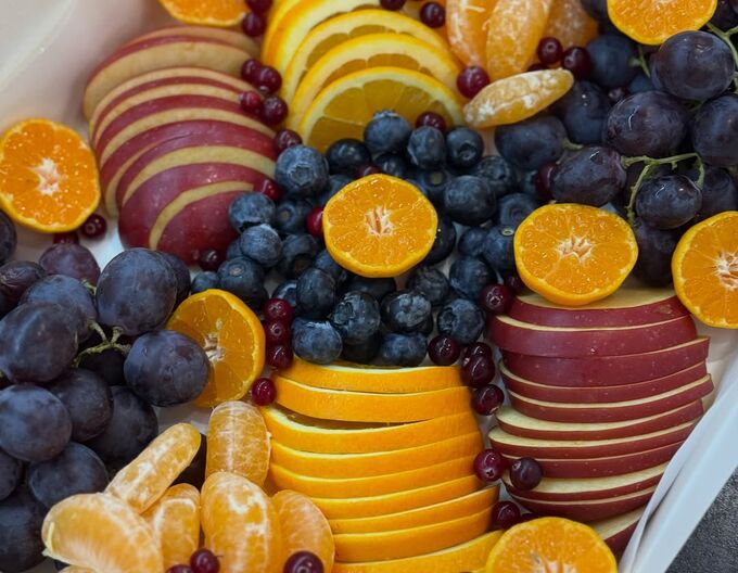 Мандарины, апельсины, виноград, яблоки, голубика.