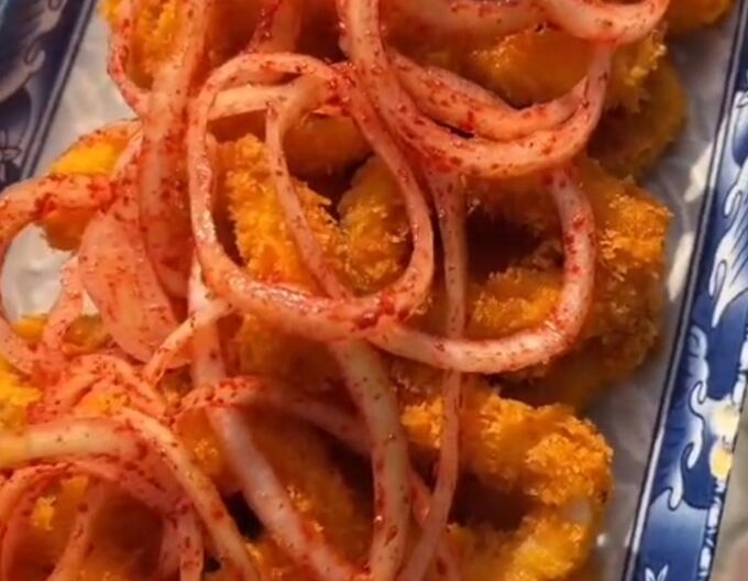 Кальмар обжаренный в кляре, лук свежий, заправлен паприкой.