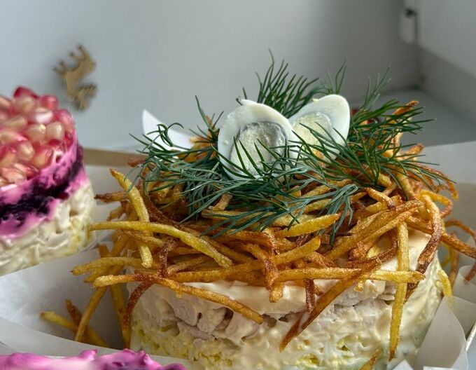 Куриное филе, яйцо, картофель, огурец свежий, майонез, картофель пай.