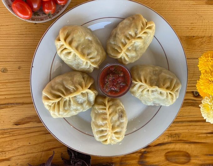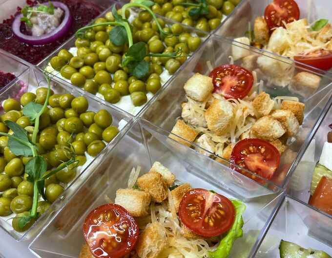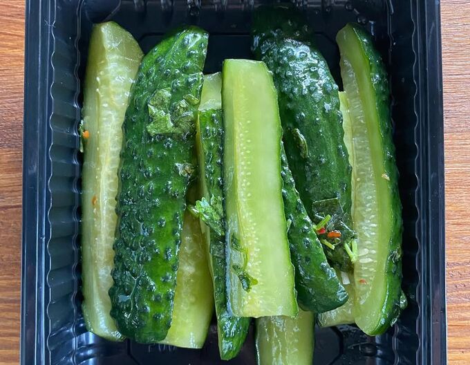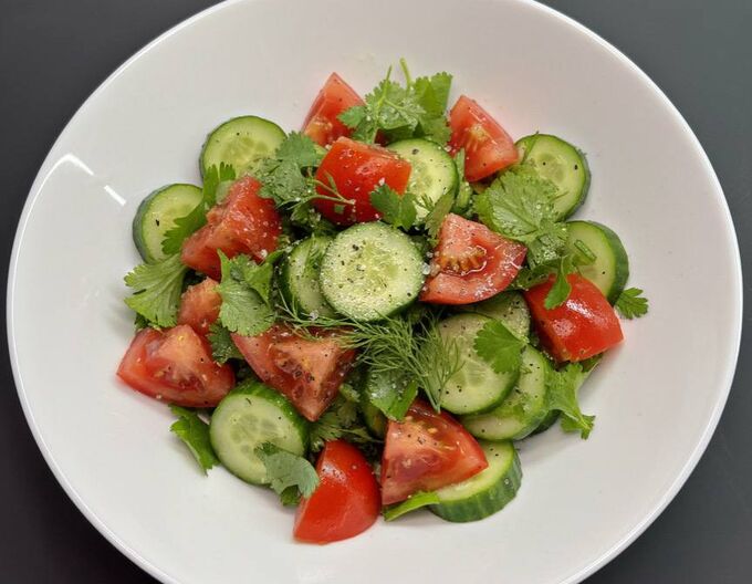 Помидоры, огурцы, укроп, петрушка, соус собственного производства.