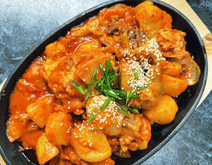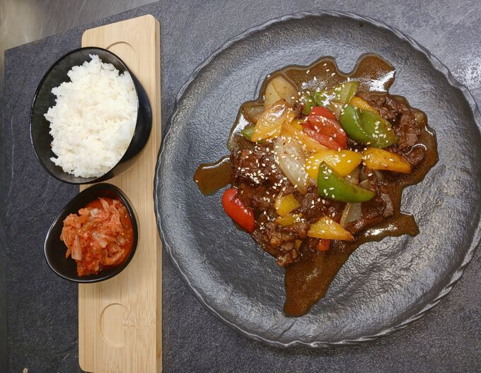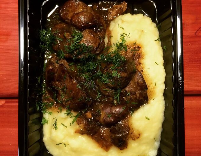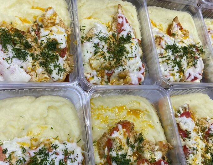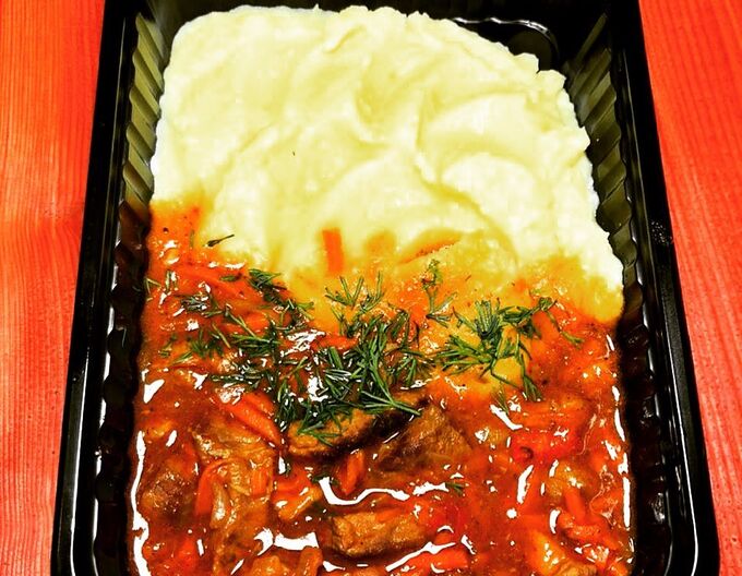 Говядина, лук, морковь, перец болгарский трех видов, картофельное пюре.