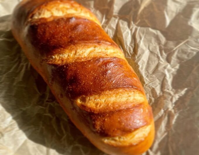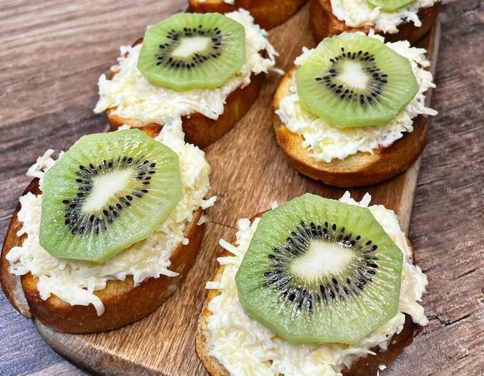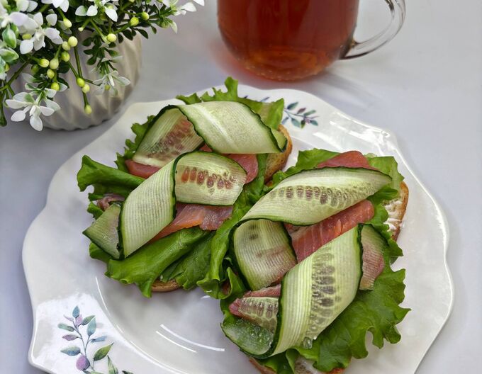 Батон, творожный сыр, малосольная форель, лист салата, огурец свежий.