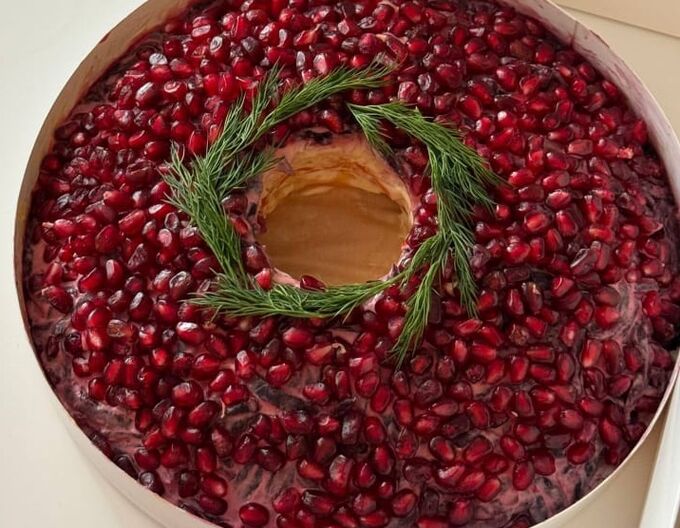 Картофель, морковь, лук репчатый, свекла, майонез, гранат.