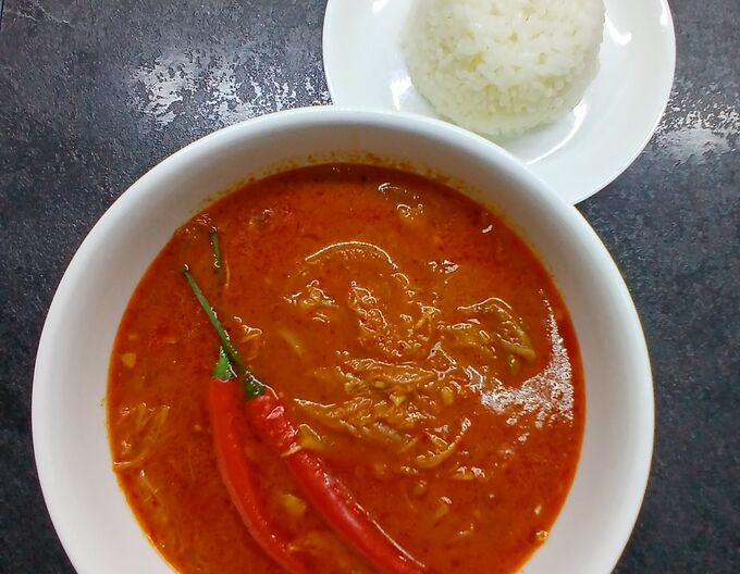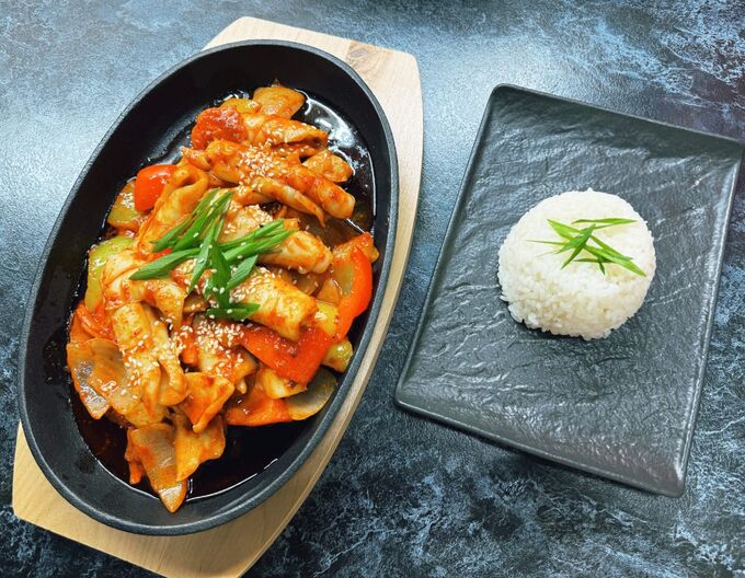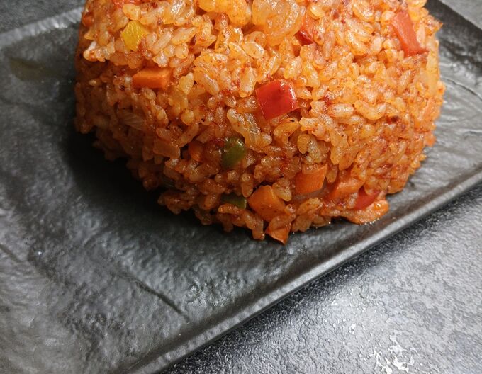 Рис, креветка, щупальца кальмара, три вида перца, лук.
