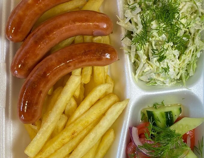 Сосиски гриль, картофель фри, капуста, зелень, помидоры, огурцы, соус чесночный, соус сырный, соус томатный.