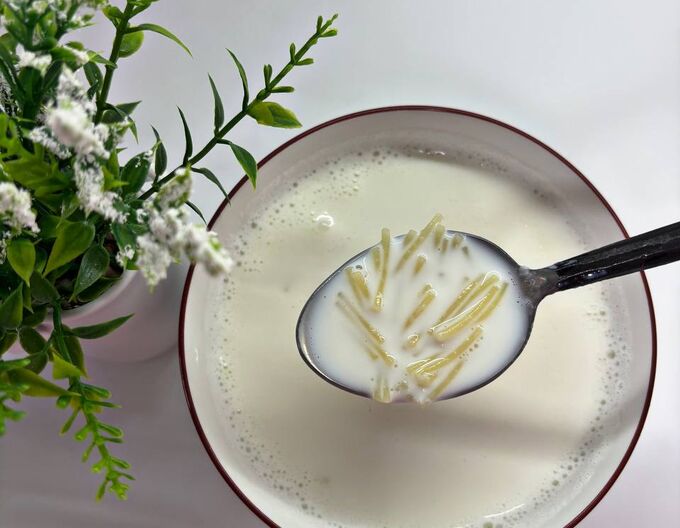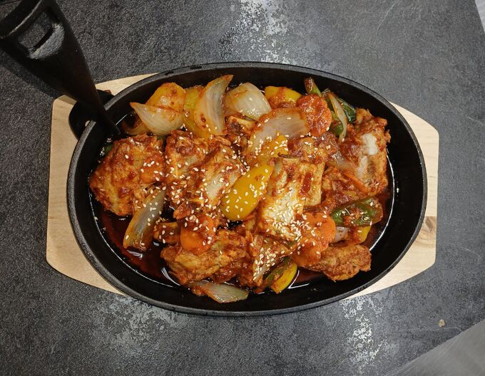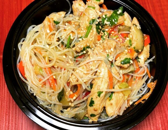 Куриное филе, лук, болгарский перец трех видов, соевый соус, лапша крахмальная.