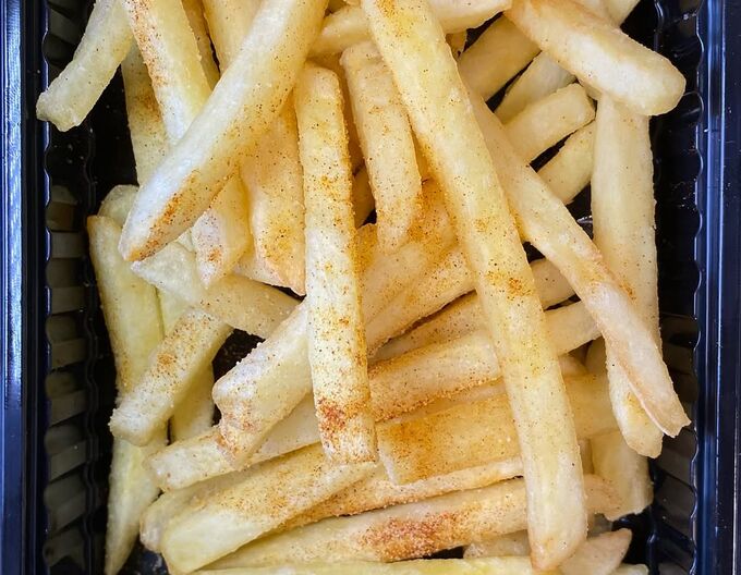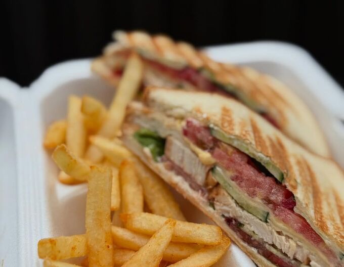 Картофель фри, тостовый хлеб, помидоры, огурцы, куриное филе, лист салата, соус чесночный, соус сырный.