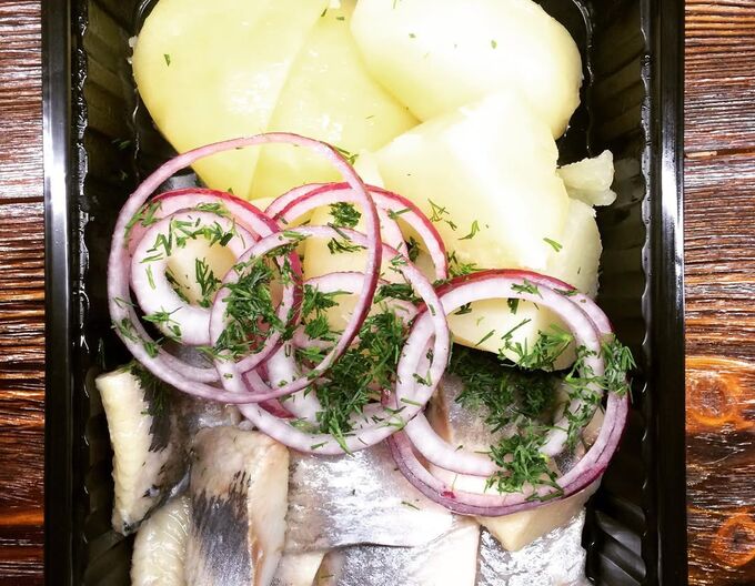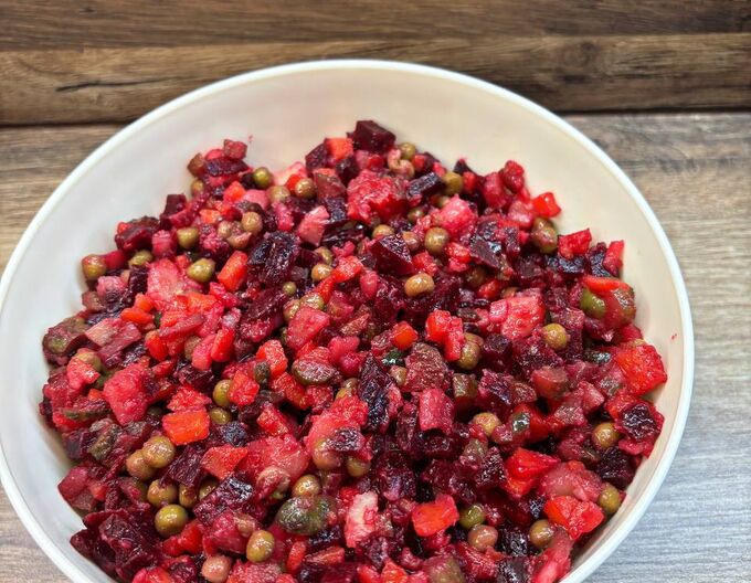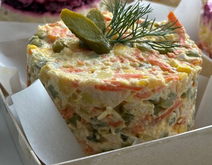 Картофель, морковь, свекла, солёные огурцы, горошек зеленый, лук.