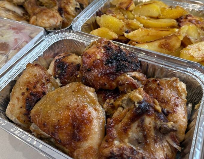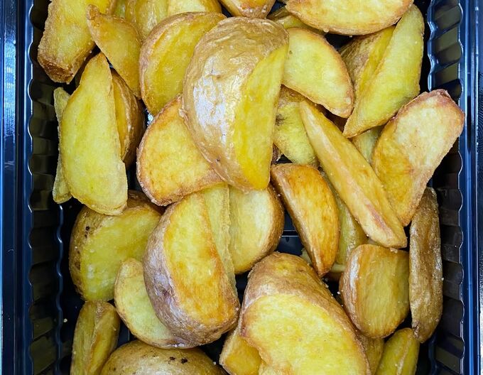 Куриное филе, сыр "Российский" помидоры, зелень, картофель, сырный соус.