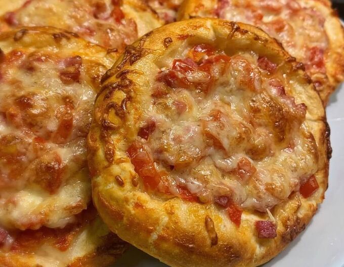 Мука, соль, молоко, помидоры, ветчина, сыр "Моцарелла".