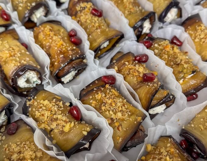Баклажаны, соус чесночный, помидоры, орехи, гранат.