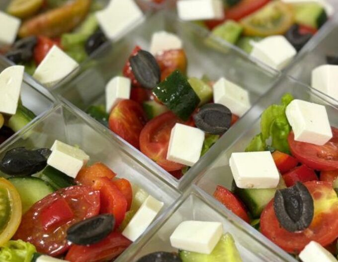 Сыр "Фетакса" или "Брынза", помидоры, огурцы, оливки, лимонный сок.