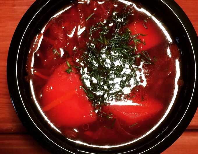 Говядина, капуста, свекла, картофель, зелень, морковь, томаты, сметана.