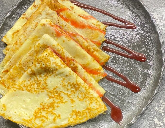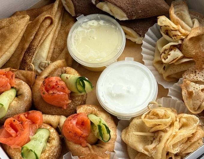 Классические блины со сметаной и сгущенкой, шоколадные блины с бананом и крем-чиз, рулетики с семгой, мешочки из блина с начинкой "Жульен".