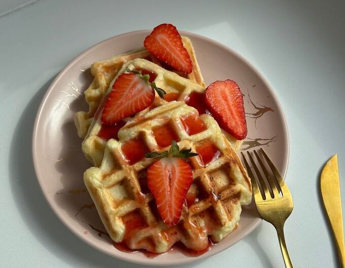 Мука, сахар, яйцо, топпинг клубника, клубника свежая.