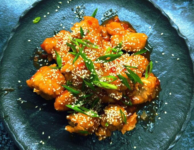 Филе куриное, кляр, соус кисло-сладкий, зеленый лук.