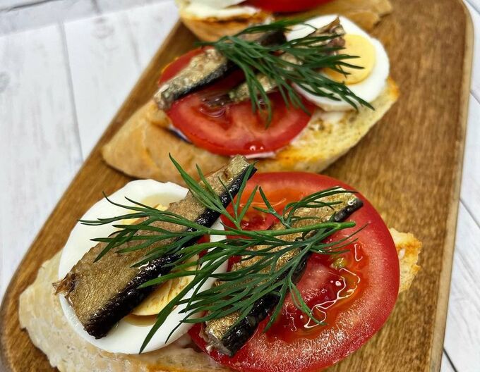 Батон, сыр сливочный, яйцо отварное, помидоры, шпроты, зелень (3 шт.).